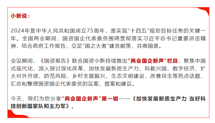 [国资小新]2024两会国企新声第一辑:加速生长新质生产力 当好科技立异国家队和主力军