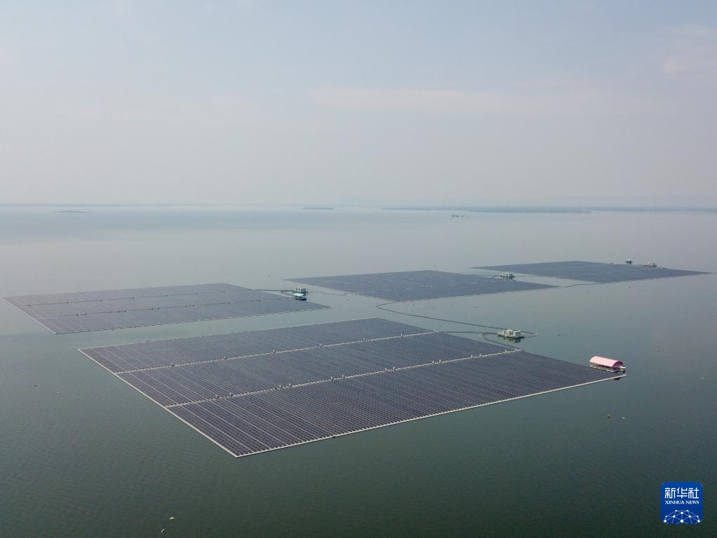 这是3月5日拍摄的泰国孔敬府乌汶叻水面漂浮光伏电站(无人机照片)。。。。。。新华社记者 林昊 摄