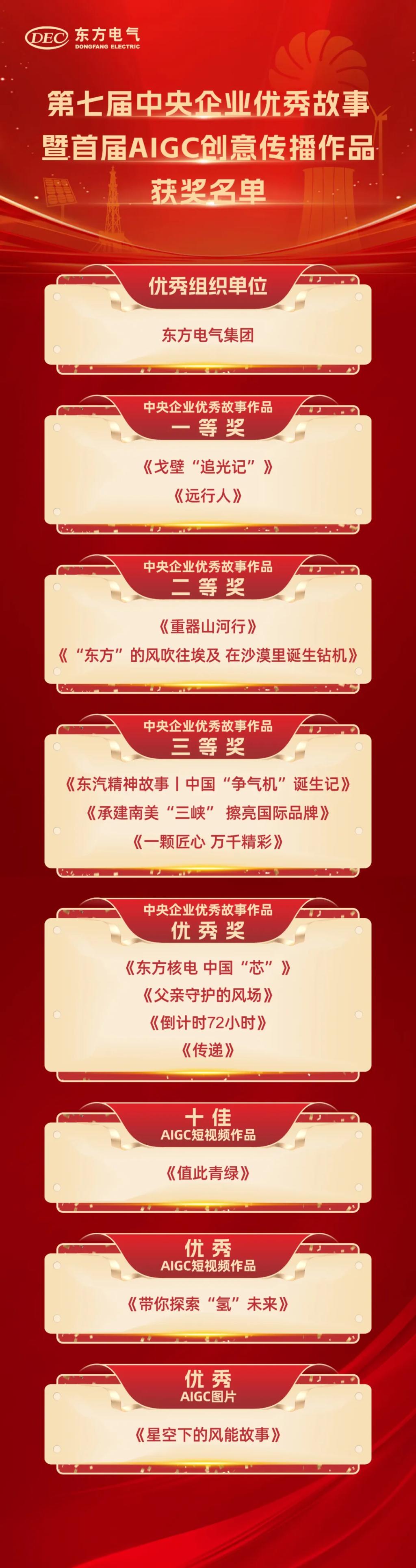 其中,,,,,,,,《沙漠“追光记”》《远行人》荣获中央企业优异故事作品一等奖,,,,,,,,《重器山河行》《“东方”的风吹往埃及 在沙漠里降生钻机》荣获中央企业优异故事作品二等奖,,,,,,,,《东汽精神故事丨中国“争气机”降生记》《承建南美“三峡”擦亮国际品牌》《一颗匠心 万千精彩》荣获中央企业优异故事作品三等奖,,,,,,,,《东方核电 中国“芯”》《父亲守护的风场》《倒计时72小时》《转达》荣获中央企业优异故事作品优异奖,,,,,,,,《值此青绿》获评十佳AIGC短视频作品,,,,,,,,《带你探索“氢”未来》获评优异AIGC短视频作品,,,,,,,,《星空下的风能故事》获评优异AIGC图片。。。。。。。